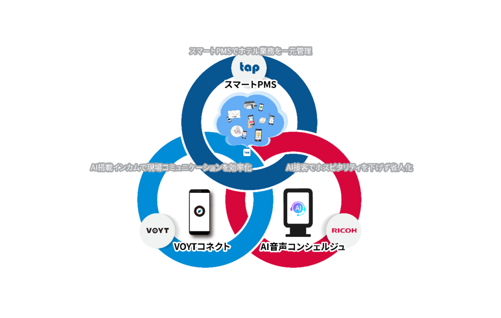 ボイットとリコージャパンとタップは、3社の協業により、こうした課題への対応を進めるお客様を支援します。リコージャパンの「RICOH Digital Signage AI音声コンシェルジュ」、タップの観光プラットフォーム基盤「スマート PMS®」、ボイットの「VOYT CONNECT」を連携し、AIを活用した問い合わせ対応やコンシェルジュサービス、無人チェックインやチェックアウトをはじめ、客室内の家電コントロール、ルームサービスのオーダー、各施設の混雑状況の確認などを実施できる環境を実現します。